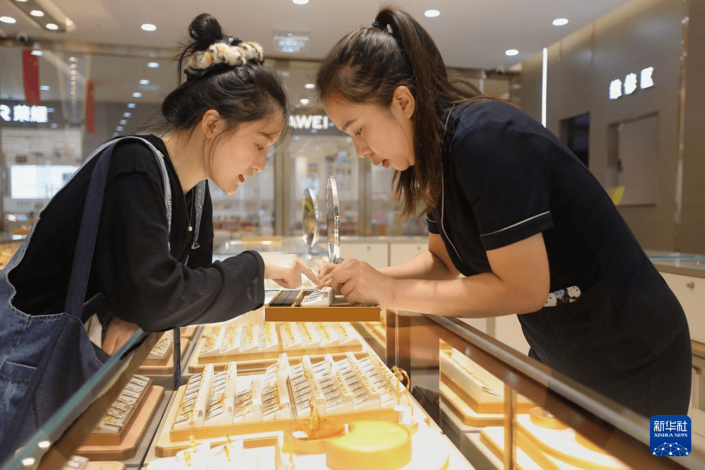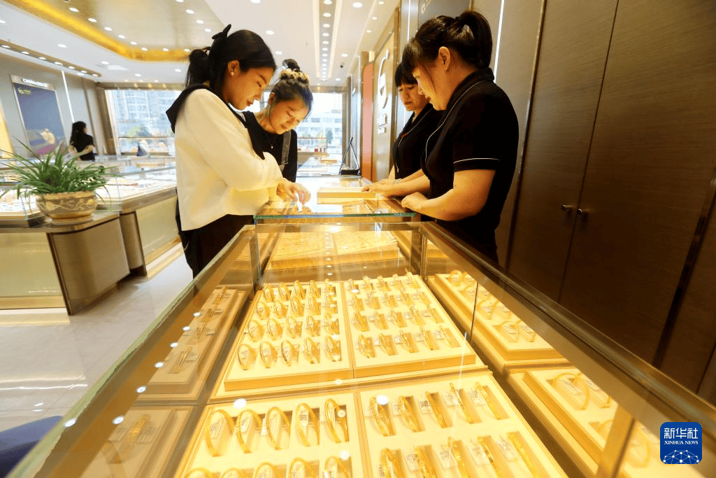 10月9日,江苏连云港,在连云区一家黄金店里,顾客在选购黄金饰品。10月13日,现货黄金价格盘中突破每盎司4070美元关口,延续此前连续8周上涨的强势表现,再创历史新高。新华社发(王春 摄)