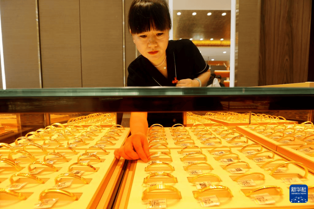 10月9日,江苏连云港,在连云区一家黄金店里,店员在整理黄金饰品。10月13日,现货黄金价格盘中突破每盎司4070美元关口,延续此前连续8周上涨的强势表现,再创历史新高。新华社发(王春 摄)