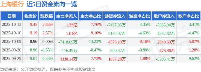 证券之星消息,截至2025年10月13日收盘,上海银行(601229)报收于9.45元,上涨2.83%,换手率1.29%,成交量182.97万手,成交额17.09亿元。