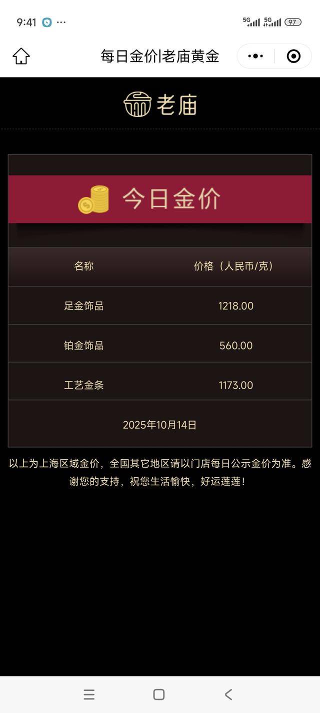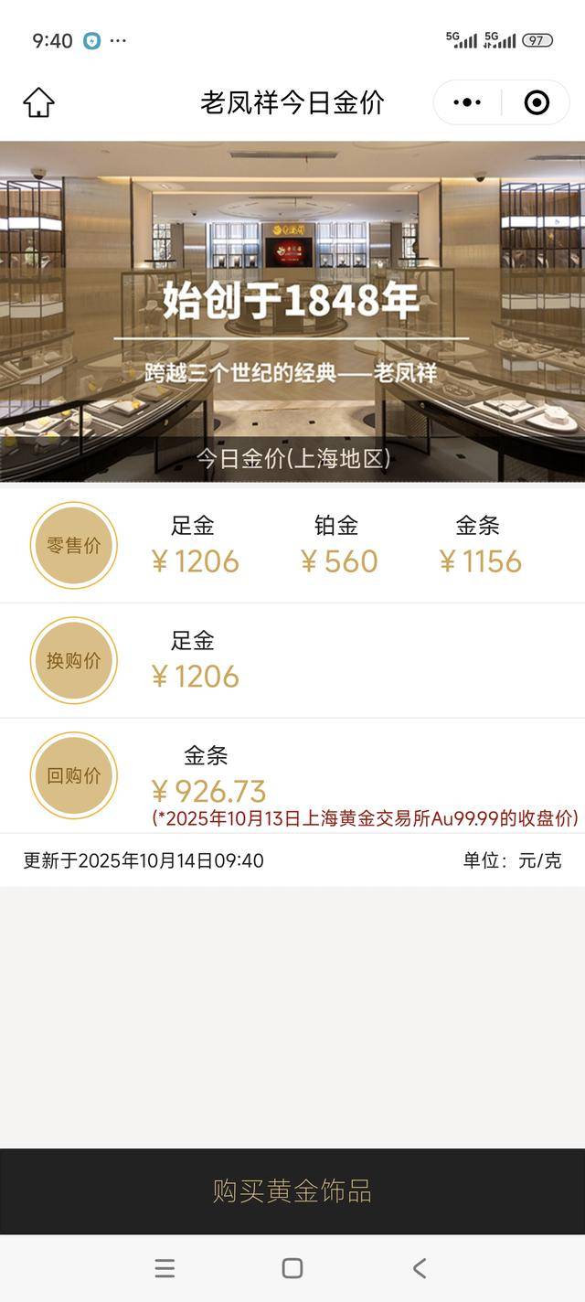 周生生金饰价格1213元/克,较前一日1188元/克的价格上涨25元/克;老庙黄金足金饰品标价1218元/克,较前一日1189元/克的价格上涨29元/克;老凤祥足金饰品标价1206元/克,克价较昨天1182元/克上涨24元。