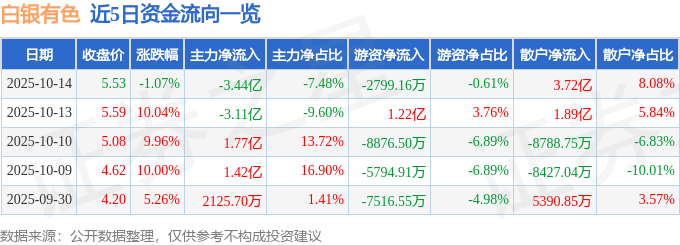 证券之星消息,截至2025年10月14日收盘,白银有色(601212)报收于5.53元,下跌1.07%,换手率10.51%,成交量778.19万手,成交额45.98亿元。