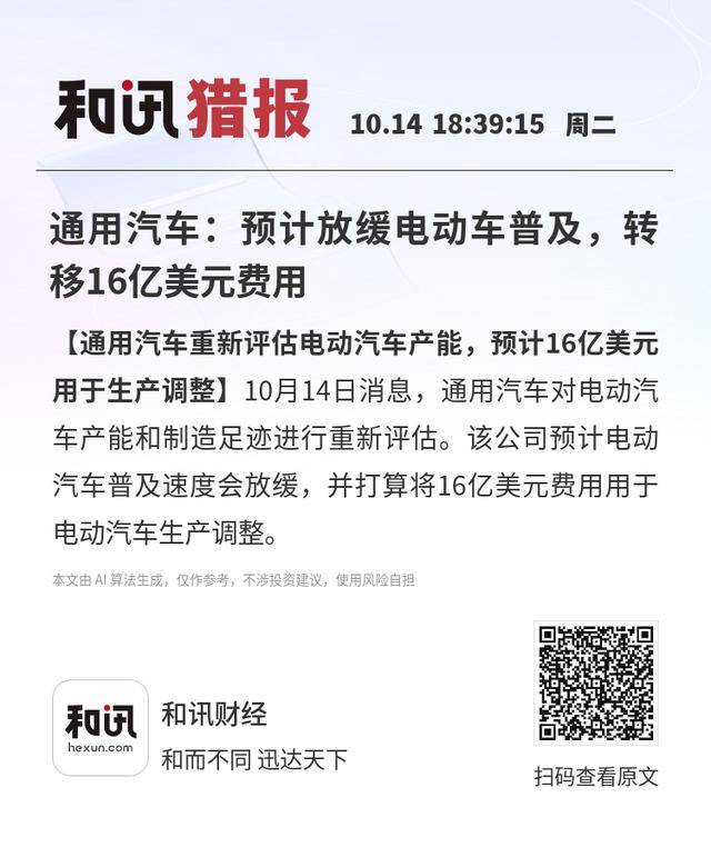 【通用汽车重新评估电动汽车产能,预计16亿美元用于生产调整】10月14日消息,通用汽车对电动汽车产能和制造足迹进行重新评估。该公司预计电动汽车普及速度会放缓,并打算将16亿美元费用用于电动汽车生产调整。