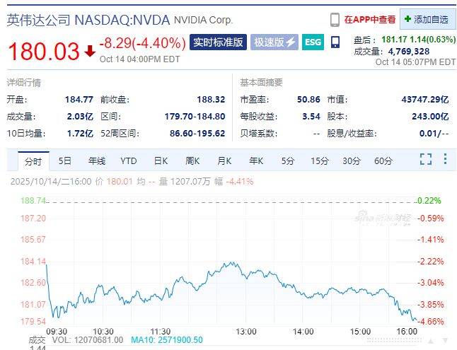 英伟达报180.03美元,跌4.40%,市值一夜蒸发2014亿美元(约合人民币14378亿元)。