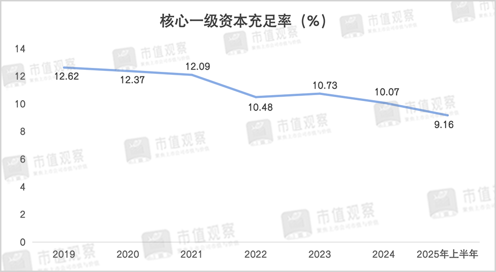 西安银行由于资产规模增长较快,也逐渐面临资本金压力。上半年核心一级资本充足率为9.16%,相较2021年前超12%的水平明显下滑。