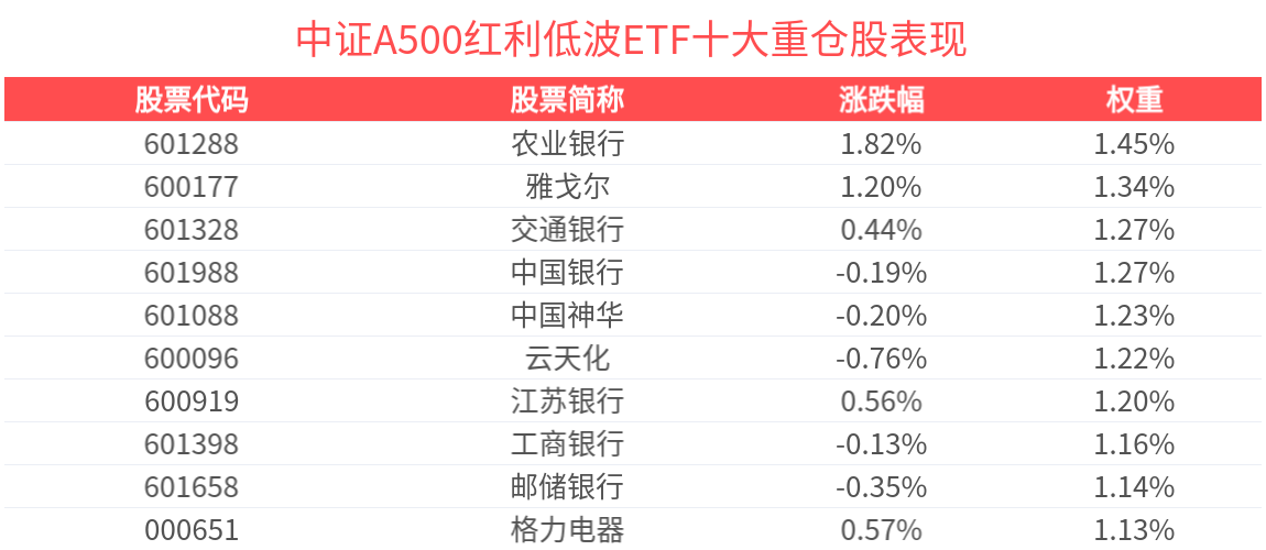 数据显示,截至2025年9月30日,中证A500红利低波动指数(932422)前十大权重股分别为农业银行(601288)、雅戈尔(600177)、中国神华(601088)、云天化(600096)、中国银行(601988)、交通银行(601328)、工商银行(601398)、江苏银行(600919)、邮储银行(601658)、格力电器(000651),前十大权重股合计占比30.72%。