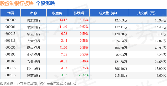 证券之星消息,10月15日股份制银行板块较上一交易日上涨0.72%,浦发银行领涨。当日上证指数报收于3912.21,上涨1.22%。深证成指报收于13118.75,上涨1.73%。股份制银行板块个股涨跌见下表: