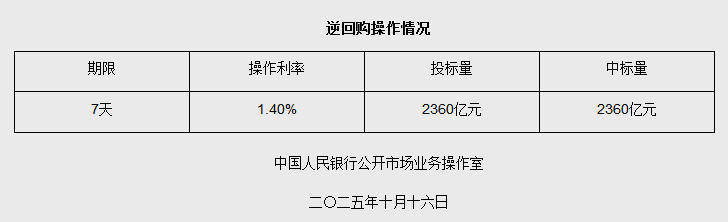 中新网10月16日电 据央行网站消息,2025年10月16日中国人民银行以固定利率、数量招标方式开展了2360亿元7天期逆回购操作。具体情况如下: