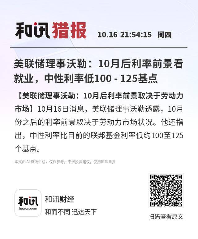 【美联储理事沃勒:10月后利率前景取决于劳动力市场】10月16日消息,美联储理事沃勒透露,10月份之后的利率前景取决于劳动力市场状况。他还指出,中性利率比目前的联邦基金利率低约100至125个基点。