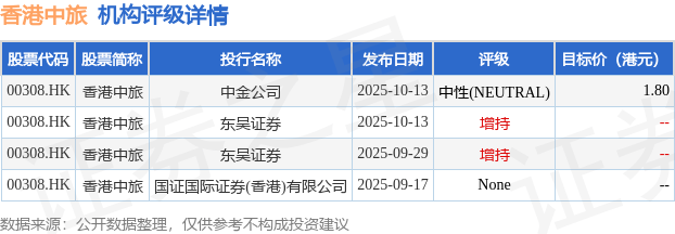 截至2025年10月17日收盘,香港中旅(00308.HK)报收于1.66港元,下跌0.6%,成交量4602.4万股,成交额7673.47万港元。投行对该股的评级以增持为主,近90天内共有2家投行给出增持评级,近90天的目标均价为1.8港元。中金公司最新一份研报给予香港中旅中性(NEUTRAL)评级,目标价1.8港元。