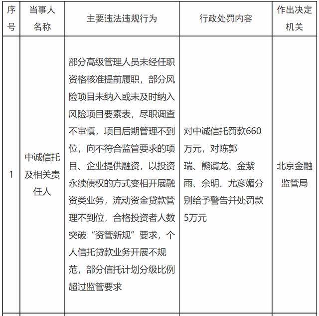 中诚信托的违法违规行为包括:部分高级管理人员未经任职资格核准提前履职,部分风险项目未纳入或未及时纳入风险项目要素表,尽职调查不审慎,项目后期管理不到位,向不符合监管要求的项目、企业提供融资,以投资永续债权的方式变相开展融资类业务,流动资金贷款管理不到位,合格投资者人数突破“资管新规”要求,个人信托贷款业务开展不规范,部分信托计划分级比例超过监管要求。北京金融监管局因此对中诚信托罚款660万元,对陈郭瑞、熊谞龙、金紫雨、余明、尤彦媚分别给予警告并处罚款5万元。