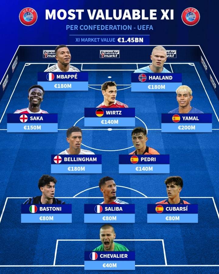 比较知名的身价统计网站《德国转会市场》不久前盘点了欧足联球员身价最高的阵容,11名入选的球员,有7人身价都超过了1亿欧元,整套阵容的总价值达到了惊人的14.5亿欧元!