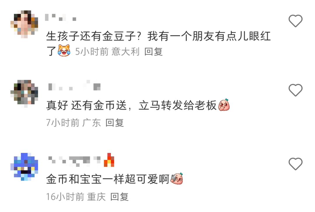 该网友表示,同事姐姐喜提人类幼崽后,拿到公司的“生育金币”,是真的金子!愿小宝宝“黄金”开局,健康成长!