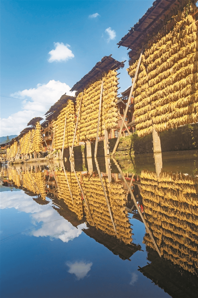 金秋时节,黔东南州从江县高增乡占里侗寨迎来香禾糯丰收季。金灿灿的稻谷挂满村头寨尾、溪边禾晾架,香禾糯倒映水中,稻香随风飘散,为秋日侗寨增添了独特魅力,勾勒出一幅幅美丽的丰收画卷。