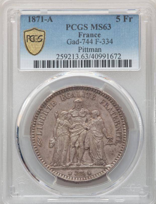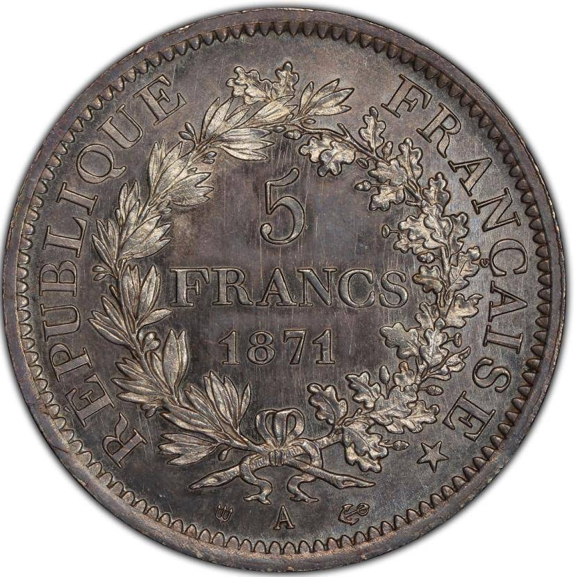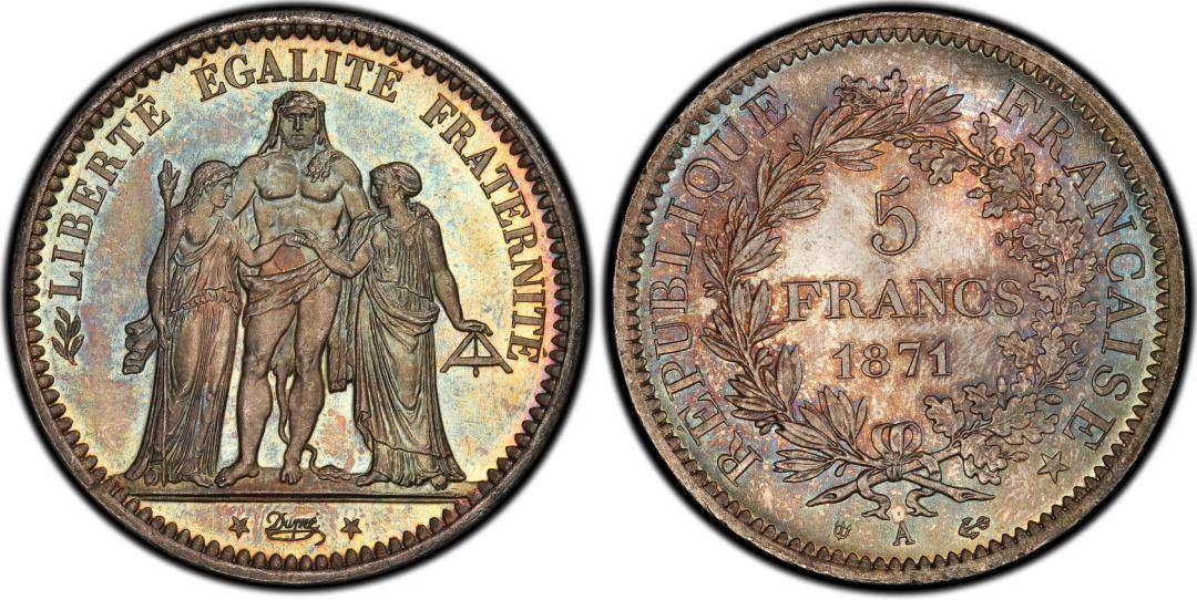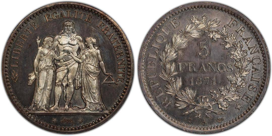 “巴黎公社”是人类历史上的第一个无产阶级政权。它仅短短存在了72天,但是它的成立和实验,影响了历史。它证明了马克思主义向现实世界的发展,也鼓舞了后来更多的无产阶级革命事业。和普通的法兰西第三共和国5法郎不同,1871年的“巴黎公社”版大力神背面左下角有一个“三叉戟”的标志,版别标注Trident,这一版大力神仅仅发行了75000枚,是19世纪法国钱币收藏的经典品种之一。