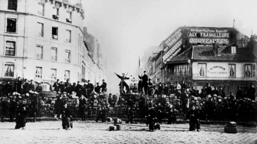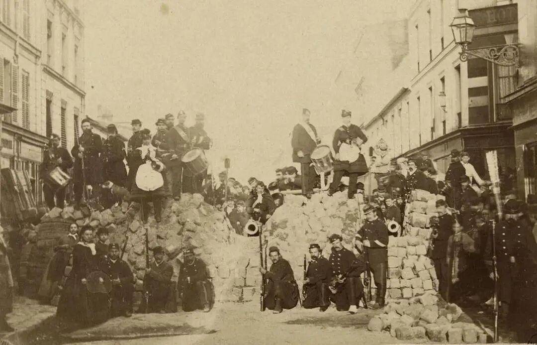 巴黎人一直不满梯也尔政府的投降,但政府军还要把储存在蒙马特高地的400多门大炮运走(剥夺不稳定的武装力量),引发了巴黎人的抗击,他们在各处搭建街垒,随后杀掉两位政府将军。梯也尔政府撤往凡尔赛让巴黎权力真空,3月26日,巴黎人通过自由选举选出了85名代表,由他们组成的公社议会负责在梯也尔政府撤离的情况下管理巴黎城市,3月28日巴黎公社宣告成立。这个议会很快开始使用“巴黎公社”的名称,法语La Commune de Paris,英语Paris Commune。