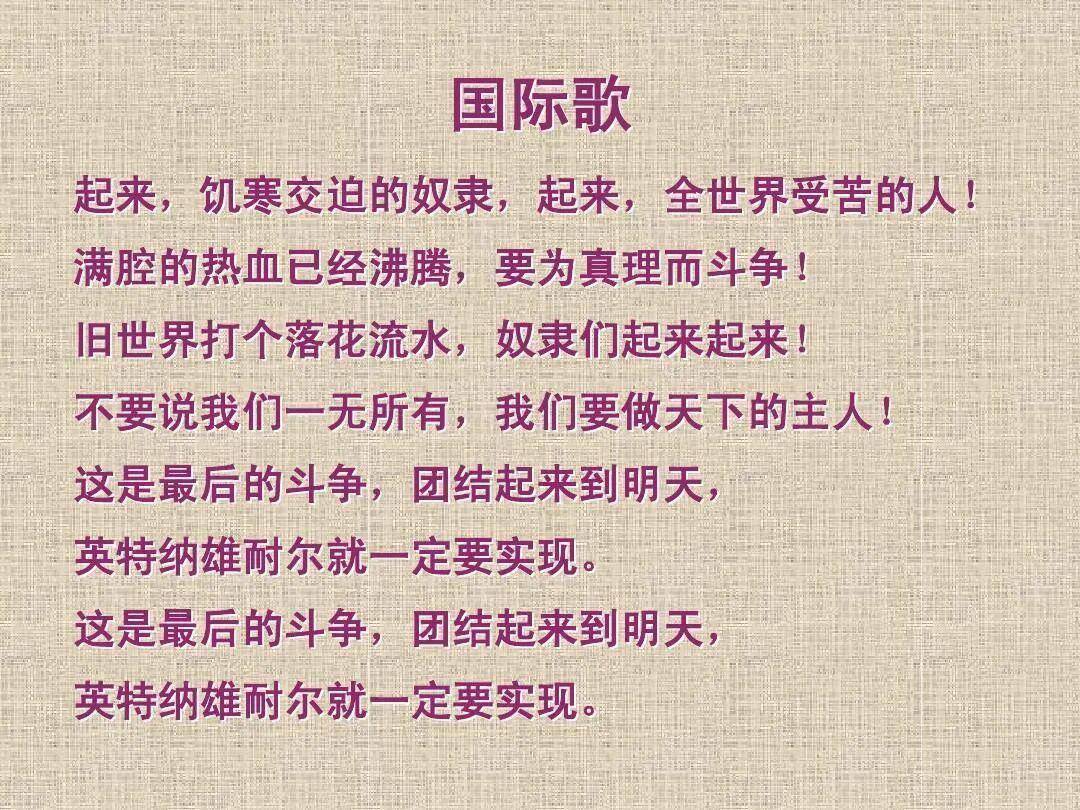 《国际歌》(法文:L'Internationale)是国际社会主义运动中最著名的一首歌。这首歌也是世界上最被广泛传唱的歌曲之一。原文(法语)的歌词由欧仁·鲍狄埃在巴黎公社运动后的1871年所作(当时用《马赛曲》的曲调演唱),皮埃尔·狄盖特于1888年为其谱曲。这首歌被翻译成世界上的许多种语言。传统上,唱《国际歌》时,常举手握拳致意。