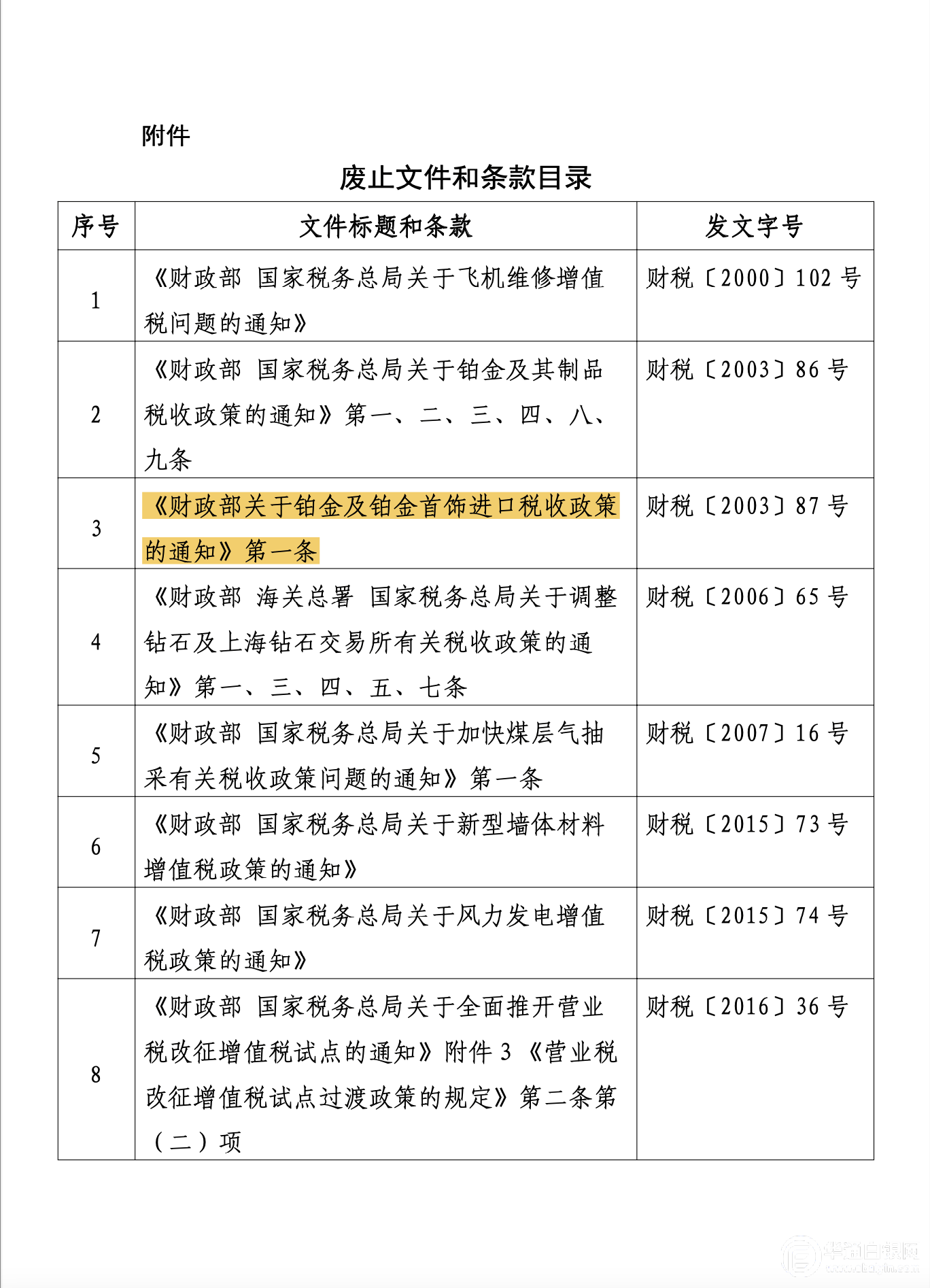 根据《公告》附件,此次废止的文件和条款涉及风电、核电、融资租赁、铂金及其制品、钻石等行业相关企业。其中,废止融资租赁业务的相关增值税优惠政策,取消铂金及其制品免征进口环节增值税政策,对贵金属行业影响尤为显著。