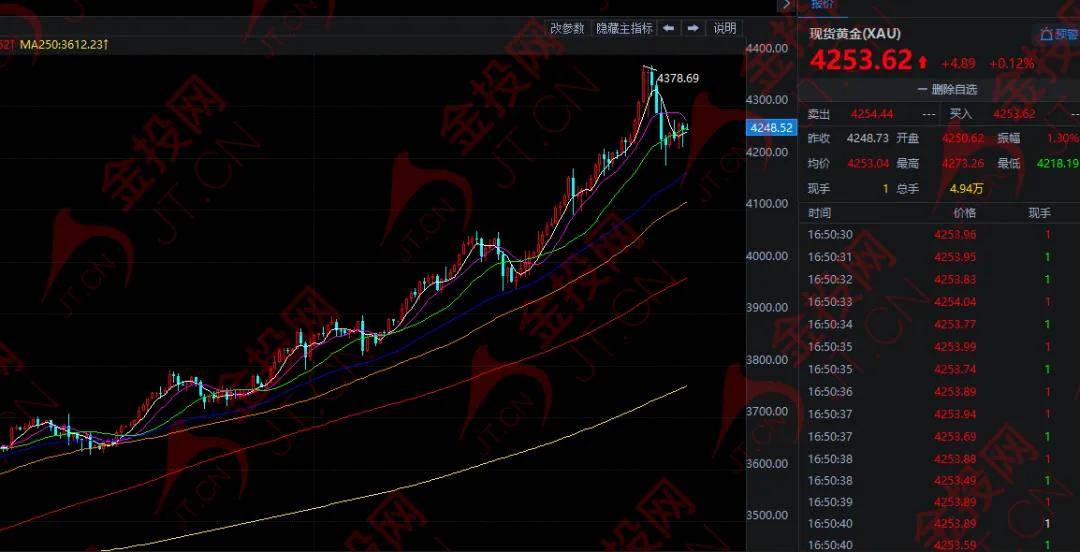 上周五,现货黄金收盘暴跌75.09美元,跌幅1.74%,报4250.91美元,金价盘初曾触及历史高点4379.94美元。尽管如此,周涨幅仍高达5.69%,实现了连续第九周上涨。今日亚市早盘,黄金一度冲高至4278.69美元的高位,目前在4253美元附近徘徊。