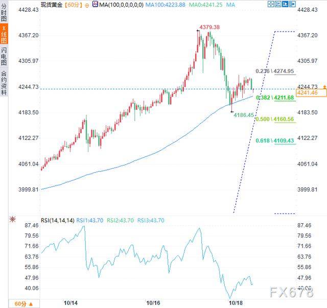 从技术面看,现货黄金上周五在4225-4205美元共振支撑带附近展现出韧性——该区域同时汇聚100小时简单移动平均线(SMA,4223.88)和10月9日至17日涨势的38.2%斐波那契回撤位(4211)。