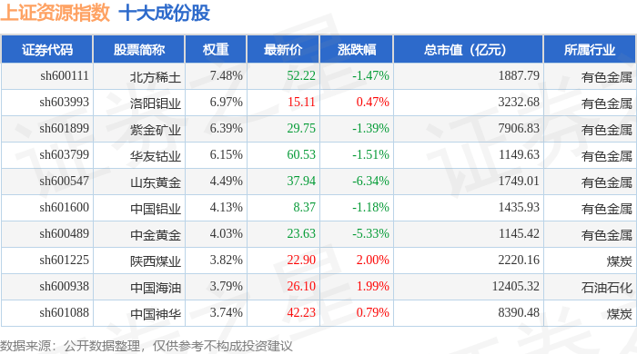 证券之星消息,10月20日,上证资源(000068)指数报收于3713.13点,跌0.38%,成交703.0亿元,换手率0.89%。当日该指数成份股中,上涨的有26家,平煤股份以9.1%的涨幅领涨,下跌的有20家,白银有色以9.95%的跌幅领跌。