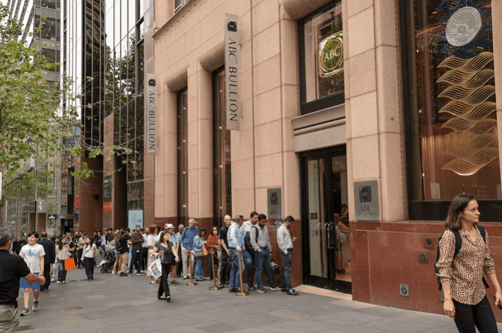 类似的场景也在澳大利亚悉尼马丁广场的黄金交易所外上演,蜿蜒的队伍里都是等待购买金条的人。
