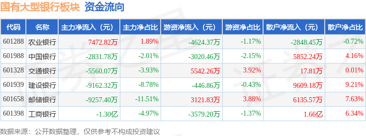 从资金流向上来看,当日国有大型银行板块主力资金净流出3.23亿元,游资资金净流出3006.81万元,散户资金净流入3.53亿元。国有大型银行板块个股资金流向见下表: