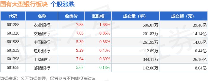 证券之星消息,10月21日国有大型银行板块较上一交易日上涨0.91%,农业银行领涨。当日上证指数报收于3916.33,上涨1.36%。深证成指报收于13077.32,上涨2.06%。国有大型银行板块个股涨跌见下表: