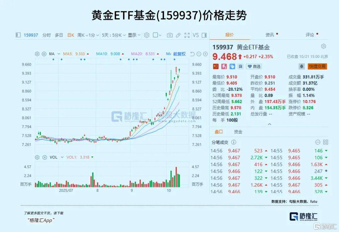 10月21日,黄金ETF基金(159937)再度收涨2.35%,重回放量上涨态势。而该ETF年内涨幅已经超过59%,表现远强于大多数其他热门赛道板块。