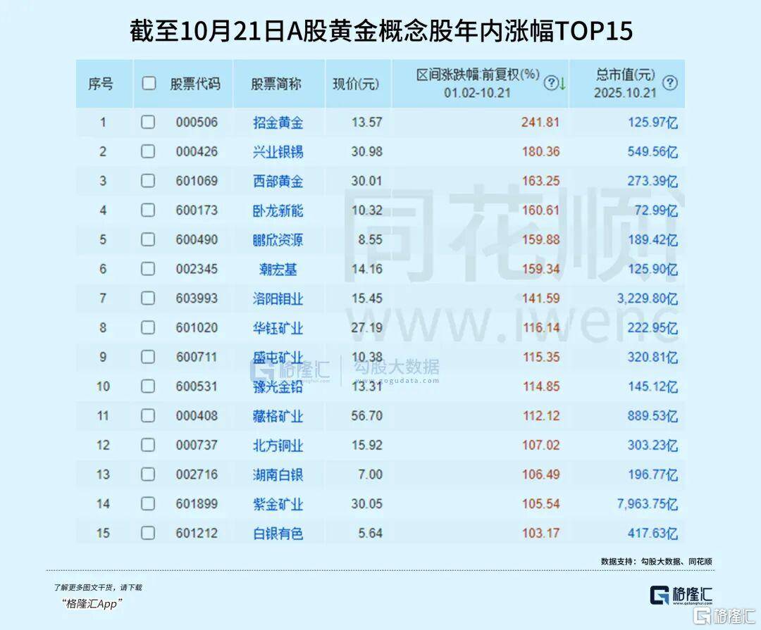 具体在个股层面,截止今日,今年A股黄金概念股同样大放异彩,A股市场有近20只黄金股实现涨幅翻倍,作为黄金股之茅的紫金矿业的A股市值也累计大涨105.6%,目前总市值达近8000亿元。