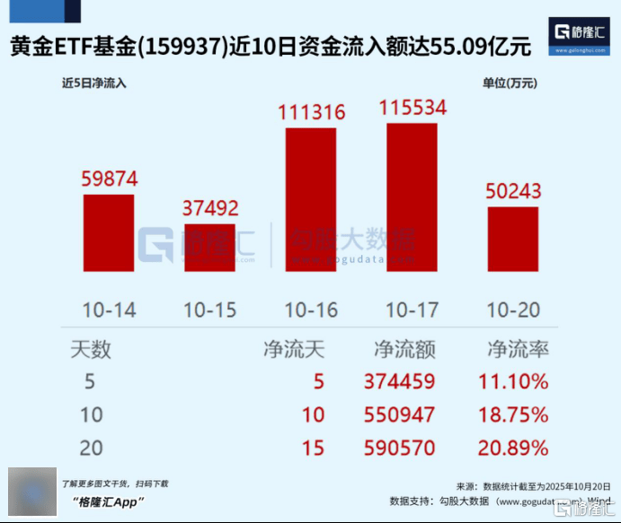 其中,黄金ETF基金(159937)连续获得资金流入,近10日流入额达55.09亿元,年内资金净流入额132.51亿元,最新规模392.57亿元,位居同类前列。
