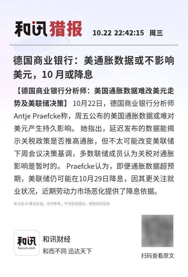 【德国商业银行分析师:美国通胀数据难改美元走势及美联储决策】10月22日,德国商业银行分析师Antje Praefcke称,周五公布的美国通胀数据或难对美元产生持久影响。 她指出,延迟发布的数据能揭示关税政策是否推高通胀,但不太可能改变美联储下周会议决策基调,多数联储成员认为关税对通胀影响是暂时的。 Praefcke认为,即便通胀数据超预期,美联储仍可能在10月29日降息,因其更关注就业状况,近期劳动力市场恶化提供了降息依据。