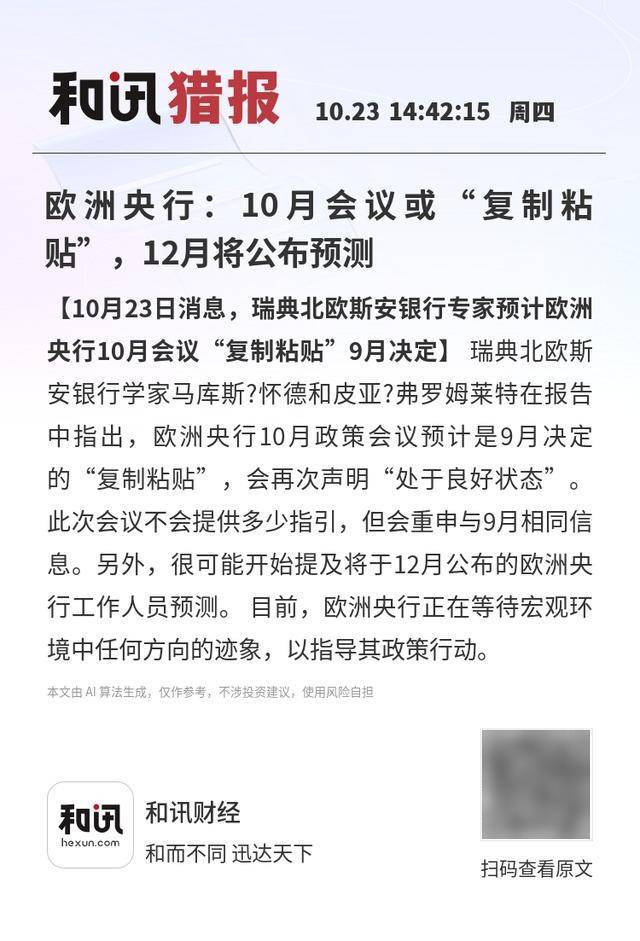 【10月23日消息,瑞典北欧斯安银行专家预计欧洲央行10月会议“复制粘贴”9月决定】瑞典北欧斯安银行学家马库斯?怀德和皮亚?弗罗姆莱特在报告中指出,欧洲央行10月政策会议预计是9月决定的“复制粘贴”,会再次声明“处于良好状态”。此次会议不会提供多少指引,但会重申与9月相同信息。另外,很可能开始提及将于12月公布的欧洲央行工作人员预测。目前,欧洲央行正在等待宏观环境中任何方向的迹象,以指导其政策行动。