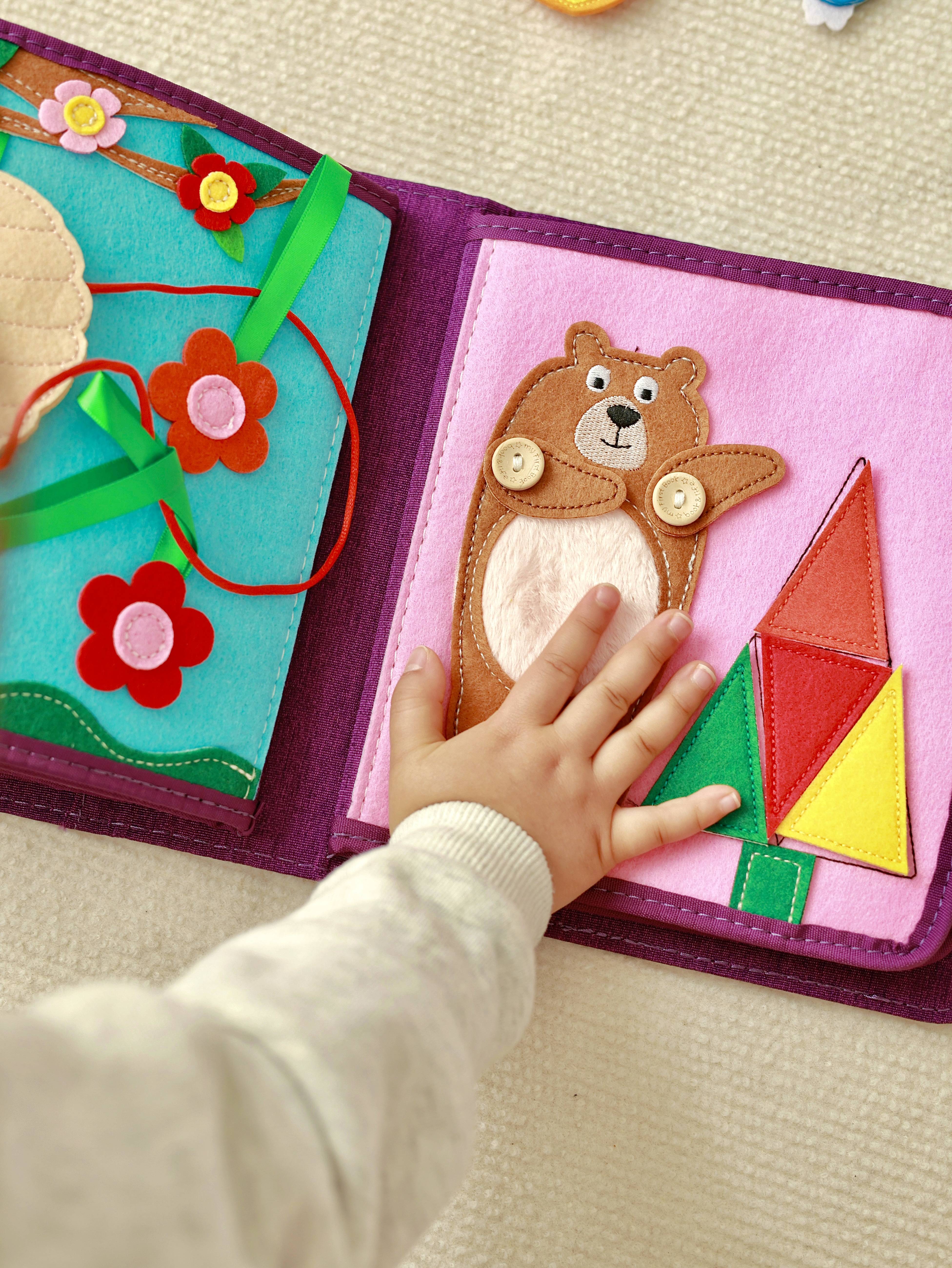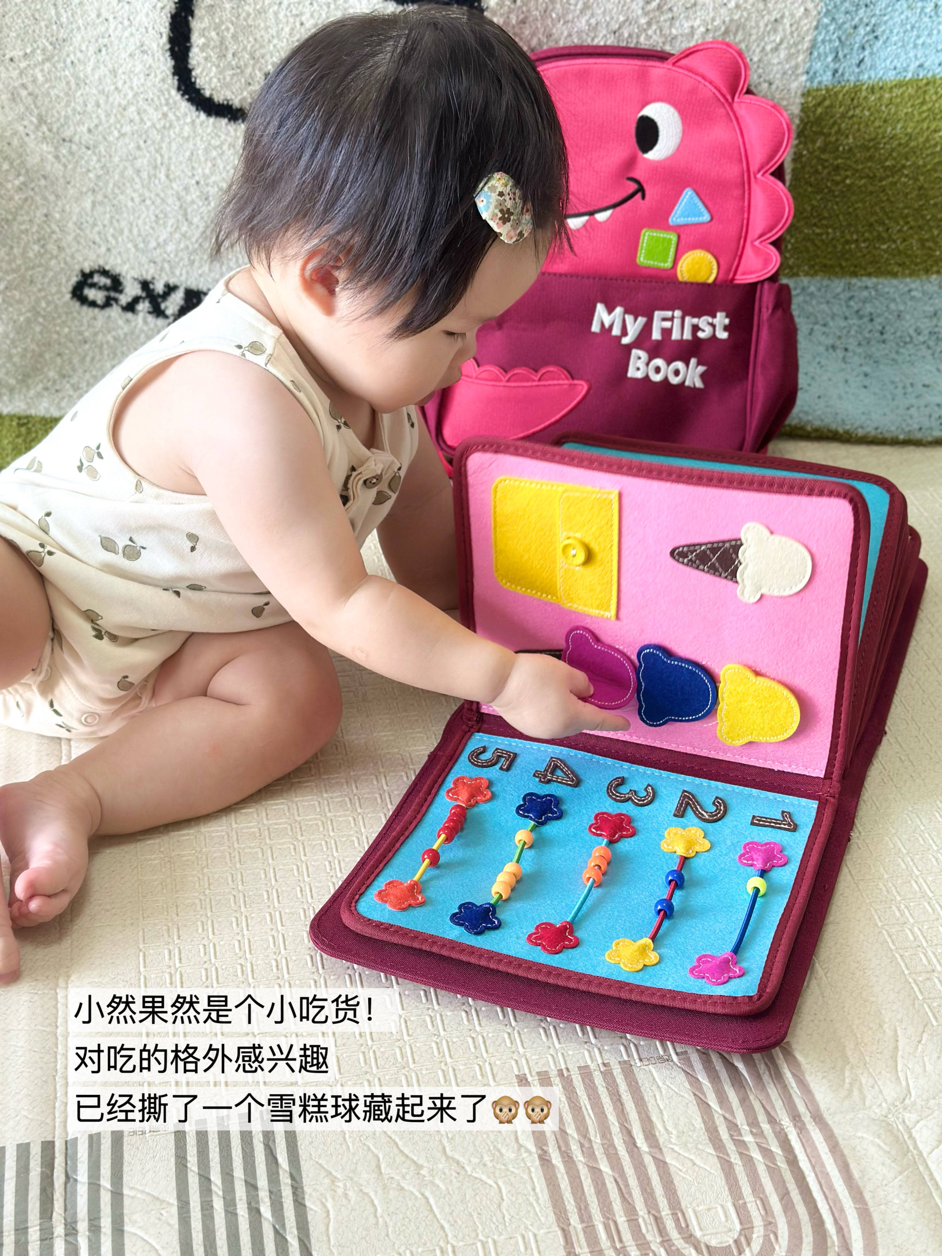 北京妈妈李女士的儿子1岁半时,总爱撕纸书、咬硬页书。改用MY FIRST BOOK的启蒙布书后,孩子被那些趣味的小机关吸引,每天花20分钟,“晾衣服”“梳辫子”“系鞋带”“摘苹果”……3个月后,专注力从3分钟延长至15分钟,并能准确说出“大苹果”“花花”“小太阳”等名称。
