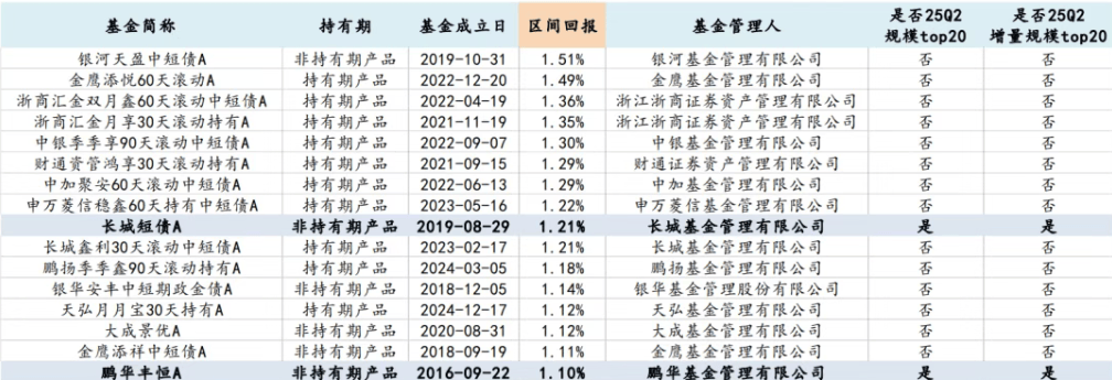 从产品端看,结合规模和收益来看有两只产品表现较为亮眼,分别是:长城短债A鹏华丰恒A,两只产品不仅在2季度业绩端排名靠前,同样在规模上也是TOP20的存在,因此这两支基金在多维度表现都较为出挑。