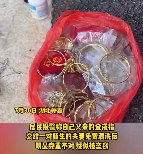 2023年8月,湖北黄冈一居民报警称:自己父亲的金戒指交给一对陌生的夫妻免费清洗后,重量明显不对,比原来少了8克,疑似被盗窃。