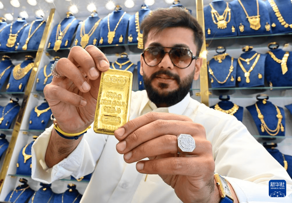 当地时间2025年10月23日,科威特首都科威特城,一名男子在金店内展示500克的金条。近期,国际金价波动加剧。今年以来,国际金价累计上涨近60%。新华社发(阿萨德 摄)