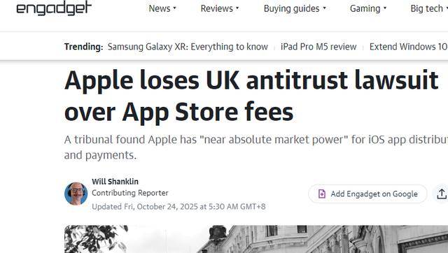 【环球网科技综合报道】10月24日消息,据外媒engadget报道,英国竞争上诉法庭日前作出重磅裁决,认定苹果在2015年至2020年间滥用市场支配地位,通过App Store向开发者收取过高佣金,这一决定可能使苹果面临高达15亿英镑的赔偿。