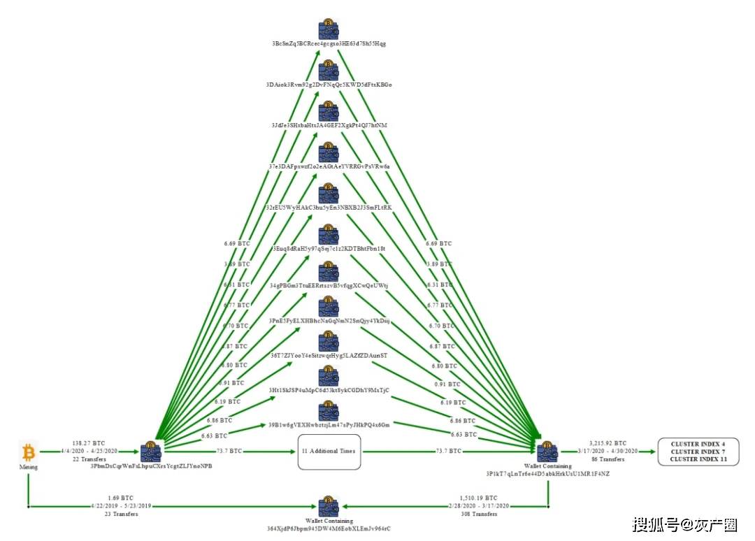FBI绘制的图表显示,来自比特币矿池的资金被分散到22个独立地址,然后重新组合成一个地址,并转移到陈志的部分钱包地址。图片来源:民事没收起诉书