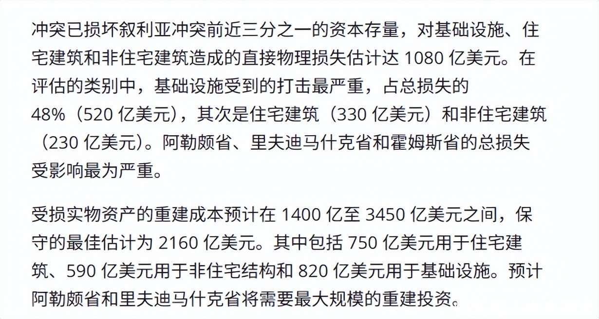 叙利亚重建所需资金超2000亿美元,战后挑战艰巨