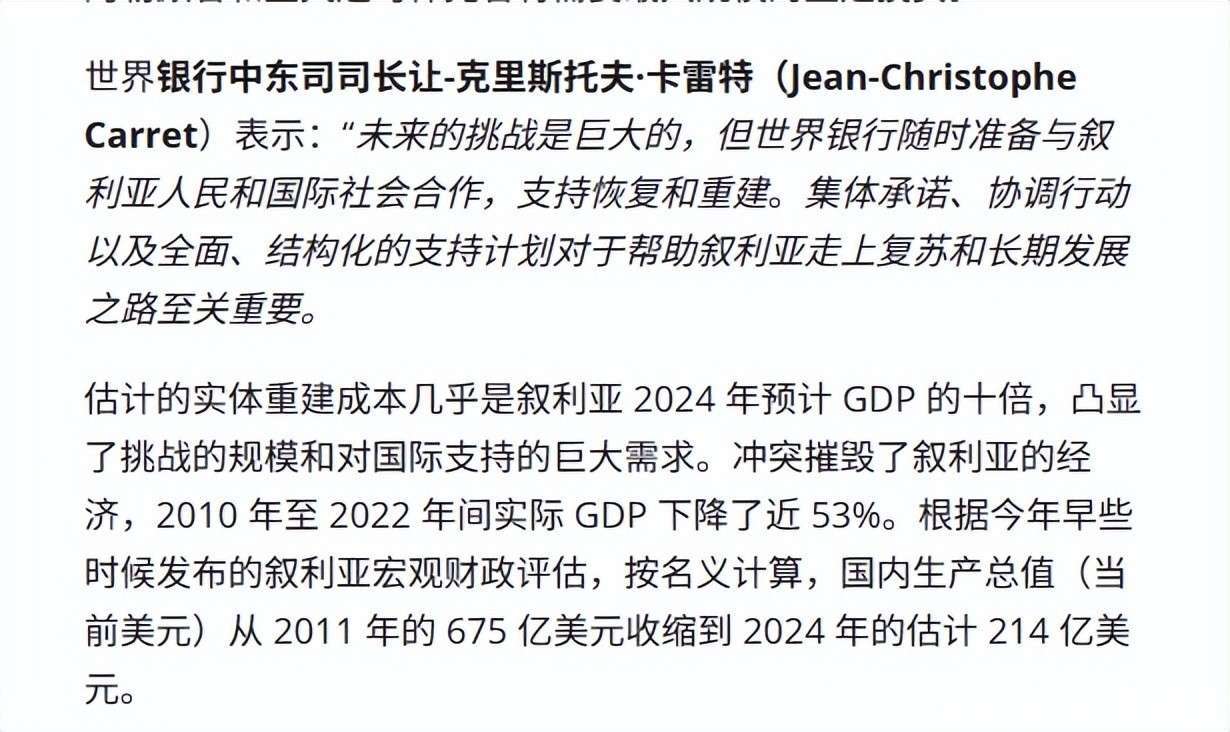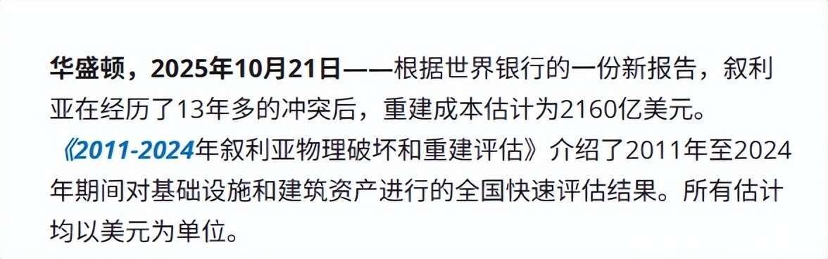世界银行报告称,叙利亚重建至少需2160亿美元,资金和社会重建面临巨大挑战。大部分民众贫困,难民问题亟待解决。