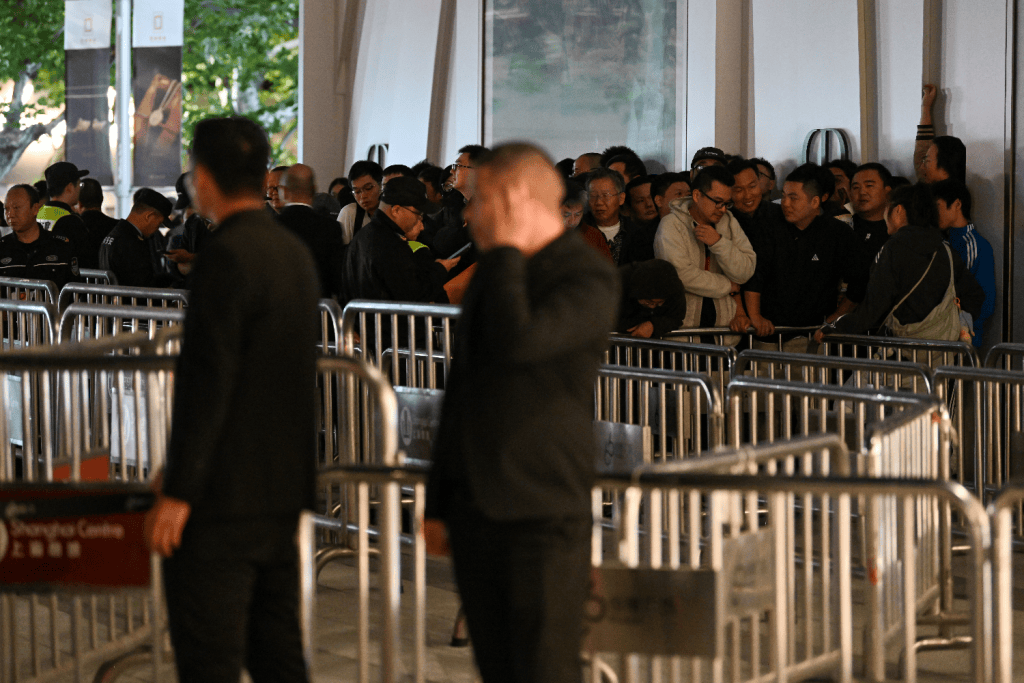 10月24日晚11点30分,澎湃新闻记者在恒隆广场现场看到,商场门口等候的队伍蜿蜒曲折,约有两三百人。他们在民警和保安的引导下,有序地站在隔离栏内。