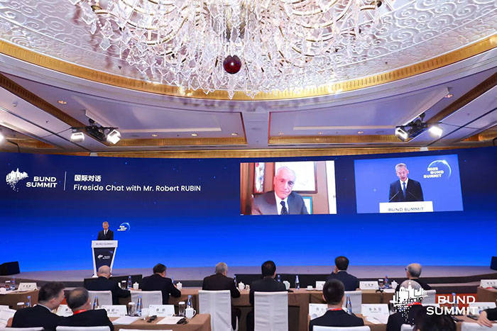 在2025外滩年会上,北大国发院院长黄益平对话美国前财长罗伯特·鲁宾。(主办方供图)