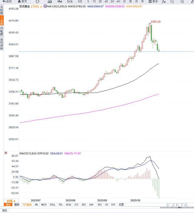 若金价持续承压并跌破3950美元支撑,则或引发进一步抛压,目标指向3900美元(对应7月至10月涨势的50%回撤位)。