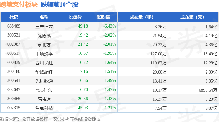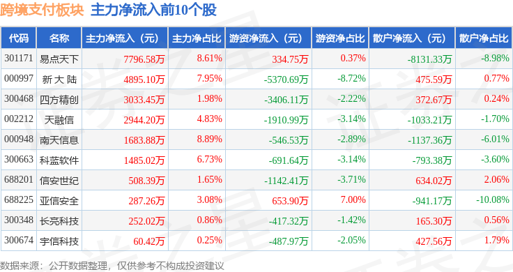 从资金流向上来看,当日跨境支付板块主力资金净流出7.7亿元,游资资金净流入1754.68万元,散户资金净流入7.53亿元。跨境支付板块个股资金流向见下表: