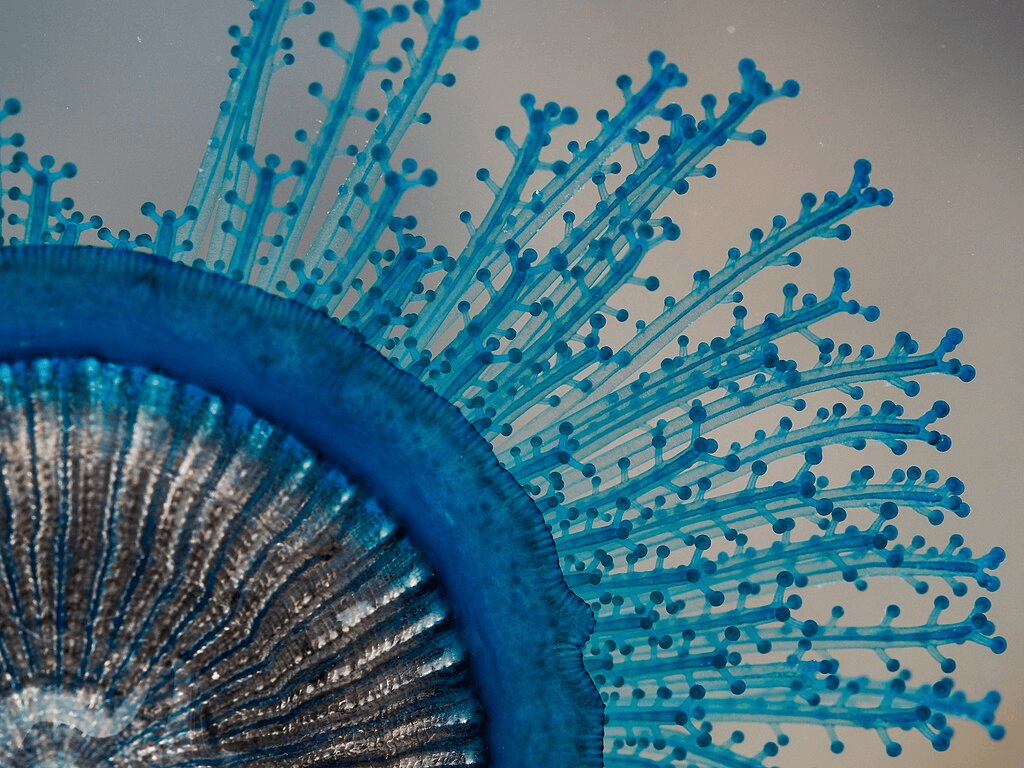 银币水母的身体结构十分精巧。近距离观察,会发现它们的浮囊体由几十个细的同心环和几十条放射肋组成。浮囊体背面,尤其是在中央附近,有许多小疣状突起。