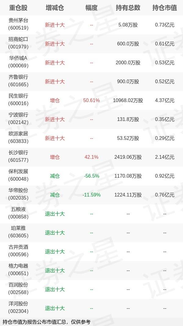 证券之星消息,10月28日国海富兰克林基金旗下赵晓东管理的富兰克林国海恒瑞债券型基金公布三季报,近1年净值增长率4.37%。与上一季度相比,该基金前十大重仓股新增贵州茅台,招商蛇口,华侨城A,齐鲁银行,宁波银行,欧派家居;并对民生银行增仓3685.72万股,为该基金第一大重仓股;五粮液,珀莱雅,古井贡酒,格力电器,百润股份,洋河股份等退出前十大重仓股;详细数据如下: