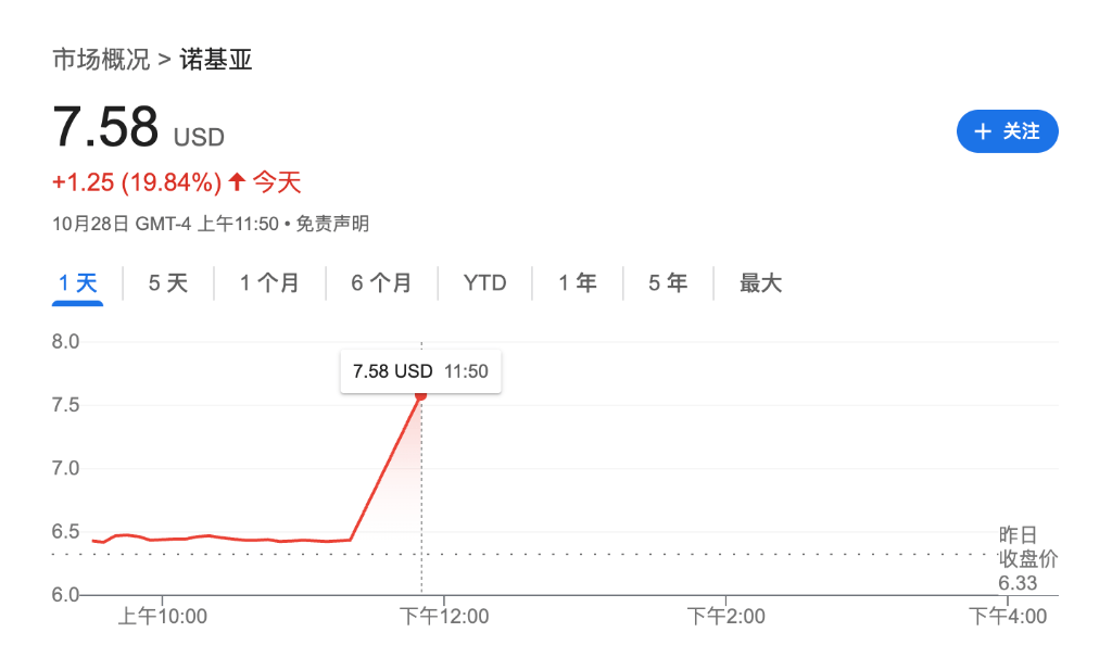 10月28日,据媒体报道,英伟达计划对诺基亚进行10亿美元的股权投资。诺基亚股价周二美股盘中直线拉升,涨近20%。