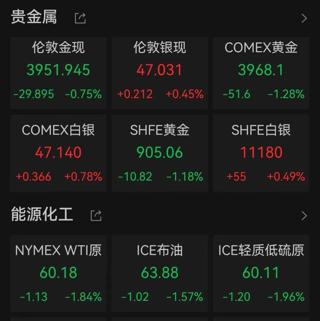 大宗商品方面,国际贵金属期现货价格日内呈现V型走势,伦敦现货黄金一度跌破3900美元/盎;原油价格跌超1%。