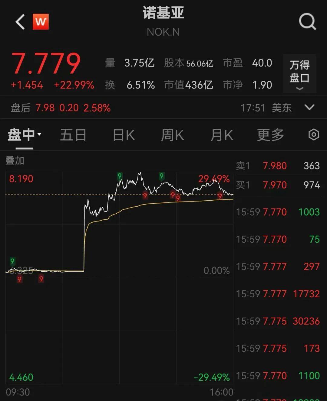 在AI与6G技术的融合应用领域,英伟达宣布与诺基亚(NOK.US)达成战略合作,计划投资10亿美元认购诺基亚股份,双方将共同推进AI原生6G网络平台的研发与建设。消息公布后,诺基亚股价迅速飙升,收盘涨近23%,最新总市值达436亿美元。