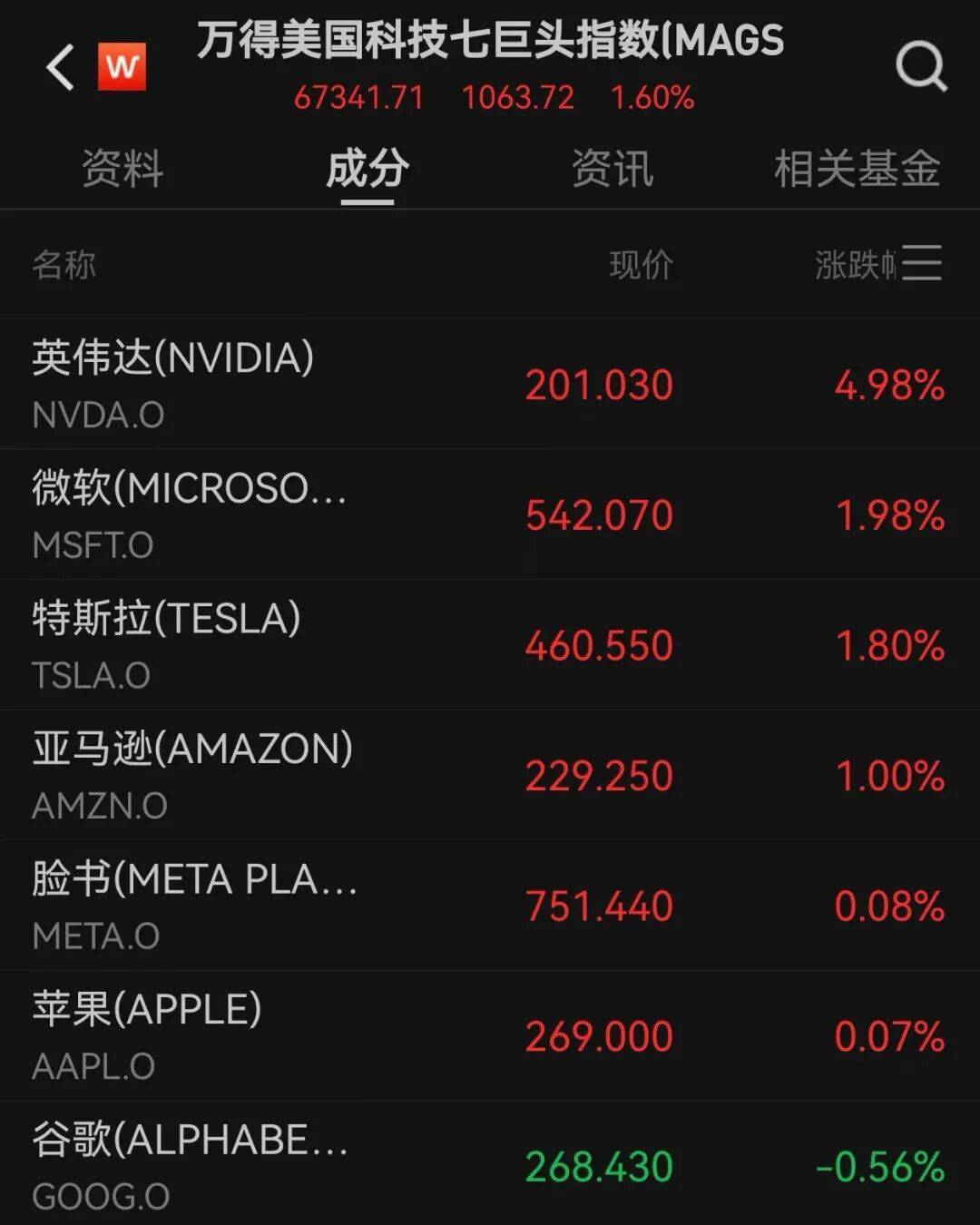 大型科技股多数上涨,万得美国科技七巨头指数涨1.6%。个股方面,微软、特斯拉涨超1%,亚马逊涨1%。微软最新总市值为4.03万亿美元,苹果盘中总市值一度升破4万亿美元,最新总市值为3.99万亿美元。